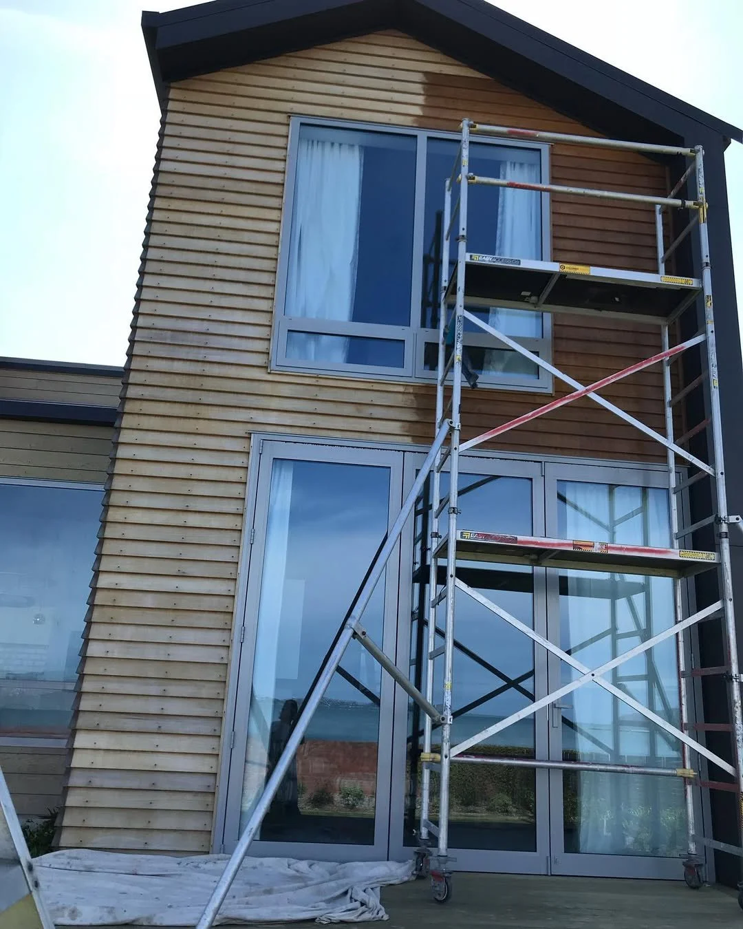 Proper scaffolding in use when staining this cedar house exterior.