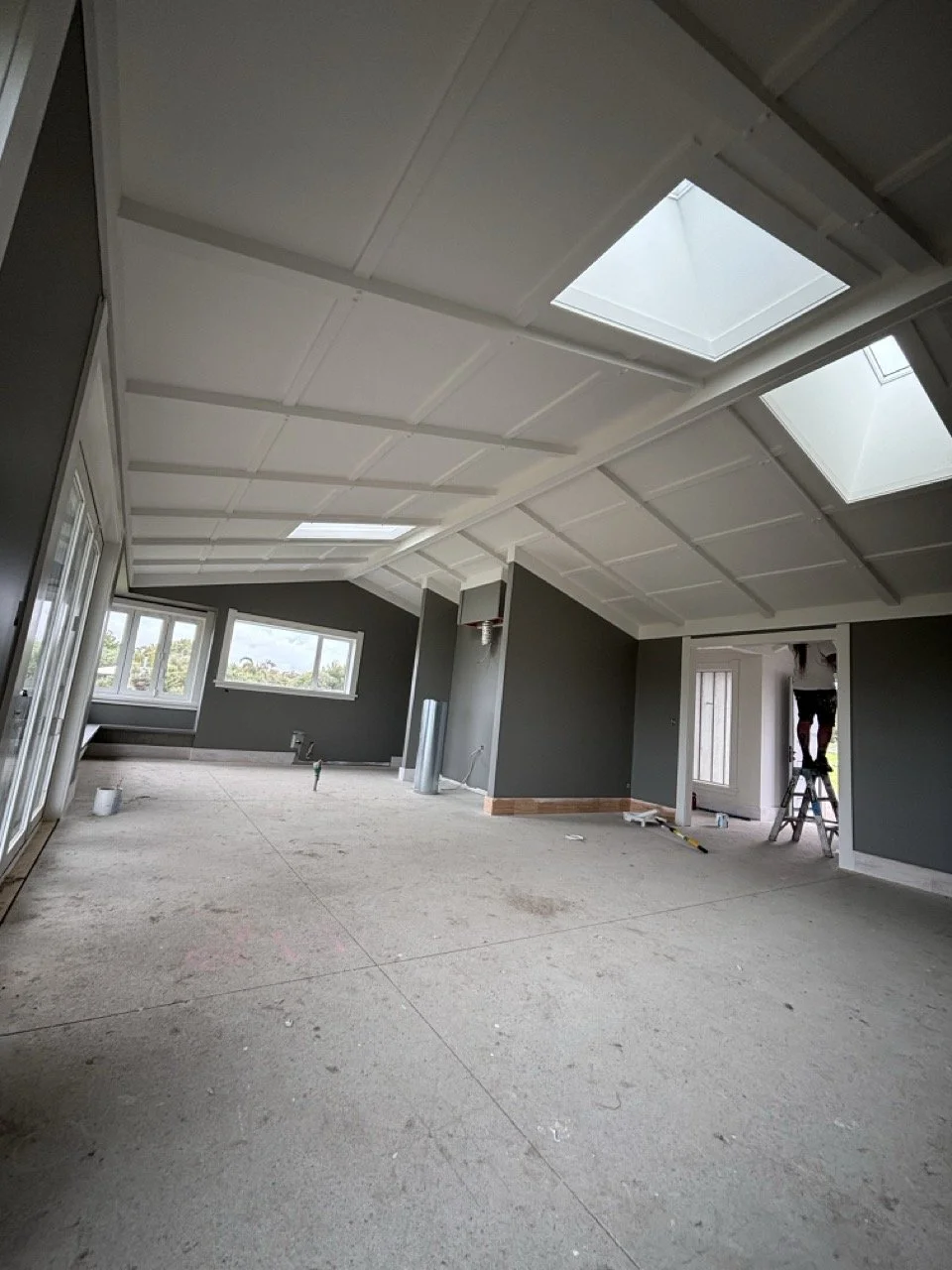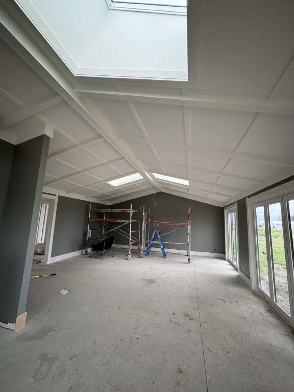 For this modern new build in Napier, we painted crisp white ceilings and trims to frame the space, paired with bold dark feature walls for contrast and depth. The combination adds warmth and character while keeping the overall look clean and contemporary.